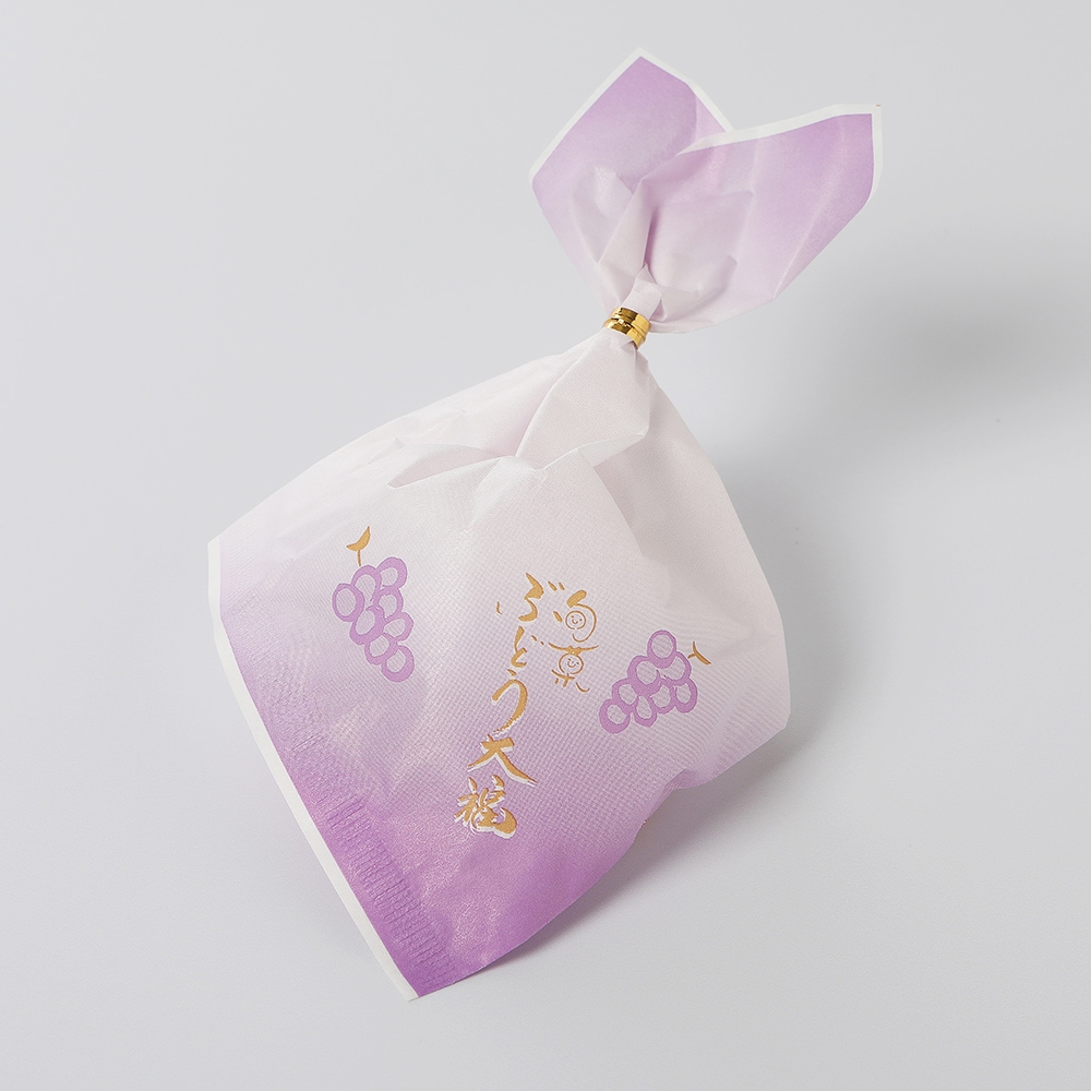 ぶどう(国産)、砂糖、手ぼう豆、もち粉、砂糖結合水飴、澱粉、麦芽糖、寒天、片栗粉 /トレハロース 製品1個あたり推定値/熱量114kcal、たんぱく質1.6g、脂質0.2g、炭水化物27.1g、食塩相当量0g
